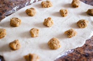 Place about 2 teaspoons of filling evenly onto the dough, leaving a 1-inch (2.5 cm) radius around the filling mounds. You should have around 15 mounds evenly spaced on one layer of dough. Gently cover with the second piece of rolled-out dough. I use the plastic wrap to help flip one layer of dough evenly on top of the filling mounds. Use a pizza cutter or ravioli wheel to cut out individual ravioli. Seal the outside of the dough with a little water and crimp the edges with a fork so that the ravioli are watertight.