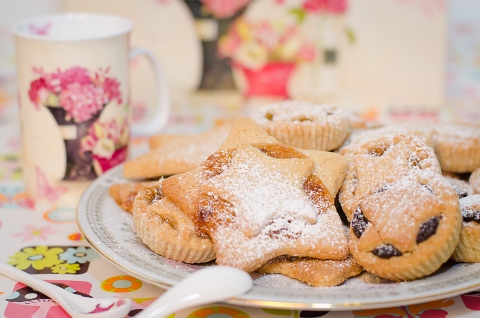 Flour your work surface and create round balls from your dough (there will be a lot of dough so you may want to have a lot of separate pieces). Use a rolling pin to flatten out your dough pieces to approx 1/2 cm and use a large round cookie cutter to create a pie shape for your cookie. Put the shape into a cupcake holder and then fill this with whatever filling you desire (I used fig jam, lime jam, chocolate sauce and peanut butter, separately).