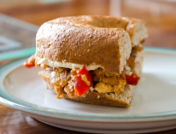 vegan scrambled Shakshuka (tofu was scrambled instead of being sliced) served in a bagel with vegan cream cheese