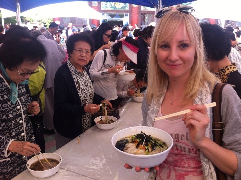 One of the coolest things about living in a foreign country is discovering local dishes and food items that are practically non-existent back home. Because I had lived in Korea before, I mistakenly assumed that I had seen it all. But all I had to do was open my eyes to see that there is vegan goodness to be found everywhere. For example, Buddha’s birthday is a major holiday here. I took the opportunity to visit a large temple where I knew there would be some vegan dishes being sold as part of the celebrations. Buddhist food is often vegan as the Buddhist philosophy is all about non-violence (as a side note there are many stellar temple food restaurants here in Seoul that are of course, all vegan). A lot of the food stalls were selling this brownish jelly resembling a discolored, opaque jello. Highly appealing, I know. I had seen it before but discounted it as I associated it with gelatin. Upon further examination, I came to know this jiggly substance as dotori muk, or acorn jelly – a great source of protein in addition to being a common Korean diet food because of its low caloric density. As well as my discovery of this new source of protein, I was also blessed with a bowl of free vegan temple noodles. It was, indeed, a Buddha’s birthday miracle.