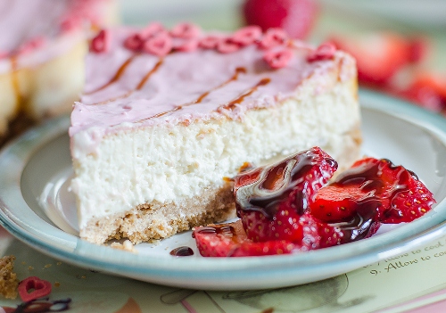 - Once cool, place into the fridge for a few hours or ideally overnight. After taking it out from the fridge, top with a layer of strawberry mousse and decorate with fresh strawberries and caramel sauce.